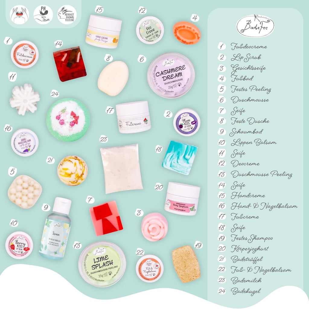 Genieße die Adventszeit Tag für Tag mit kleinen Wohlfühlmomenten: Der Badefee Adventskalender „Alpenwunder“ ist gefüllt mit 24 handgemachten Beauty- und Pflegeprodukten – von duftenden Badekugeln über cremige Seifen bis hin zu pflegenden Hand- und Fußcremes.
